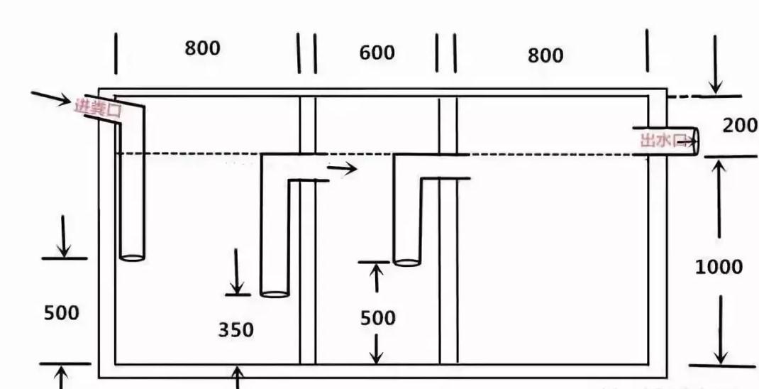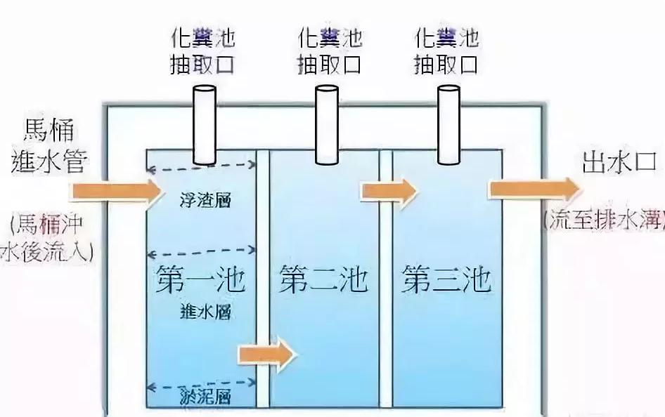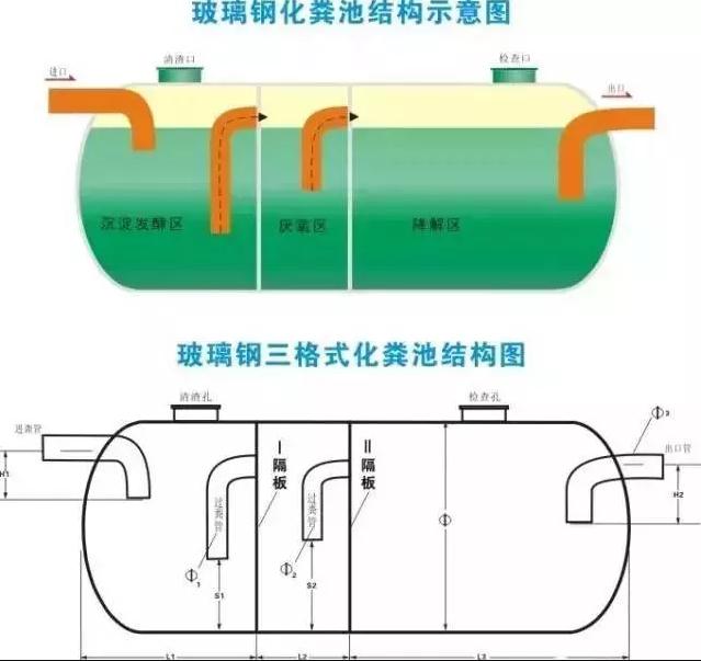 目前最常用也最實用的化糞池是三相分離化糞池,整個池體分為三個部分:一級厭氧室、二級厭氧室和澄清池。